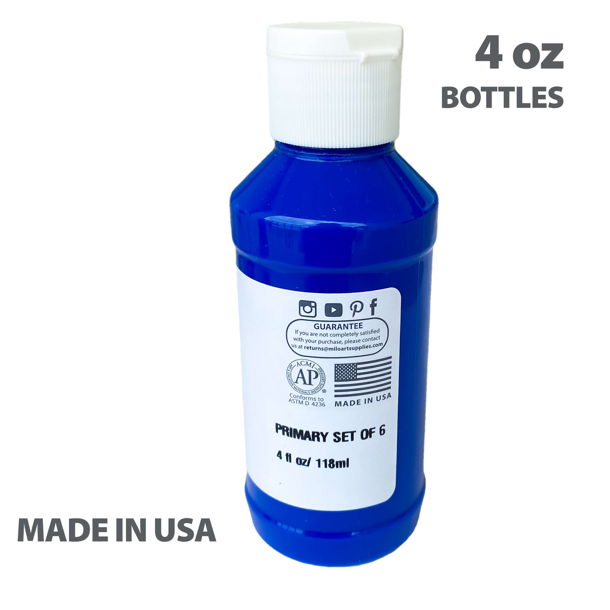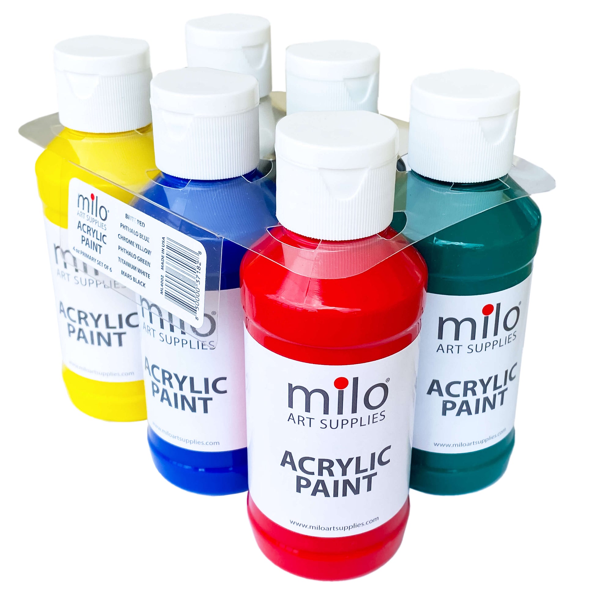 Milo Acrylic Paint comes in 4 oz bottles of 6 vibrant colors which include the primary colors plus green. Everything for you to get started on your next project.