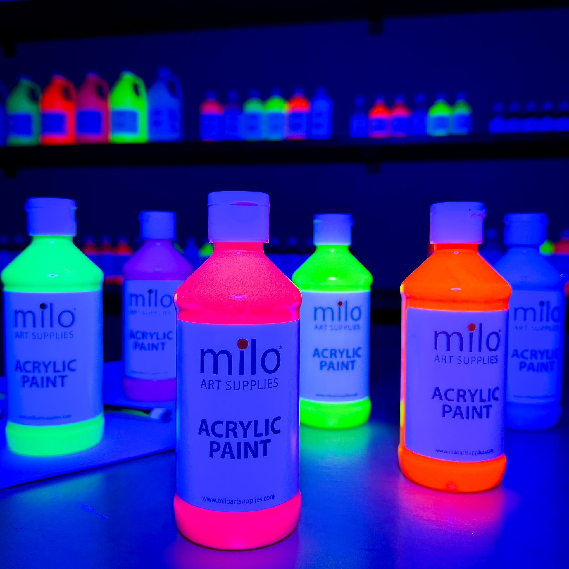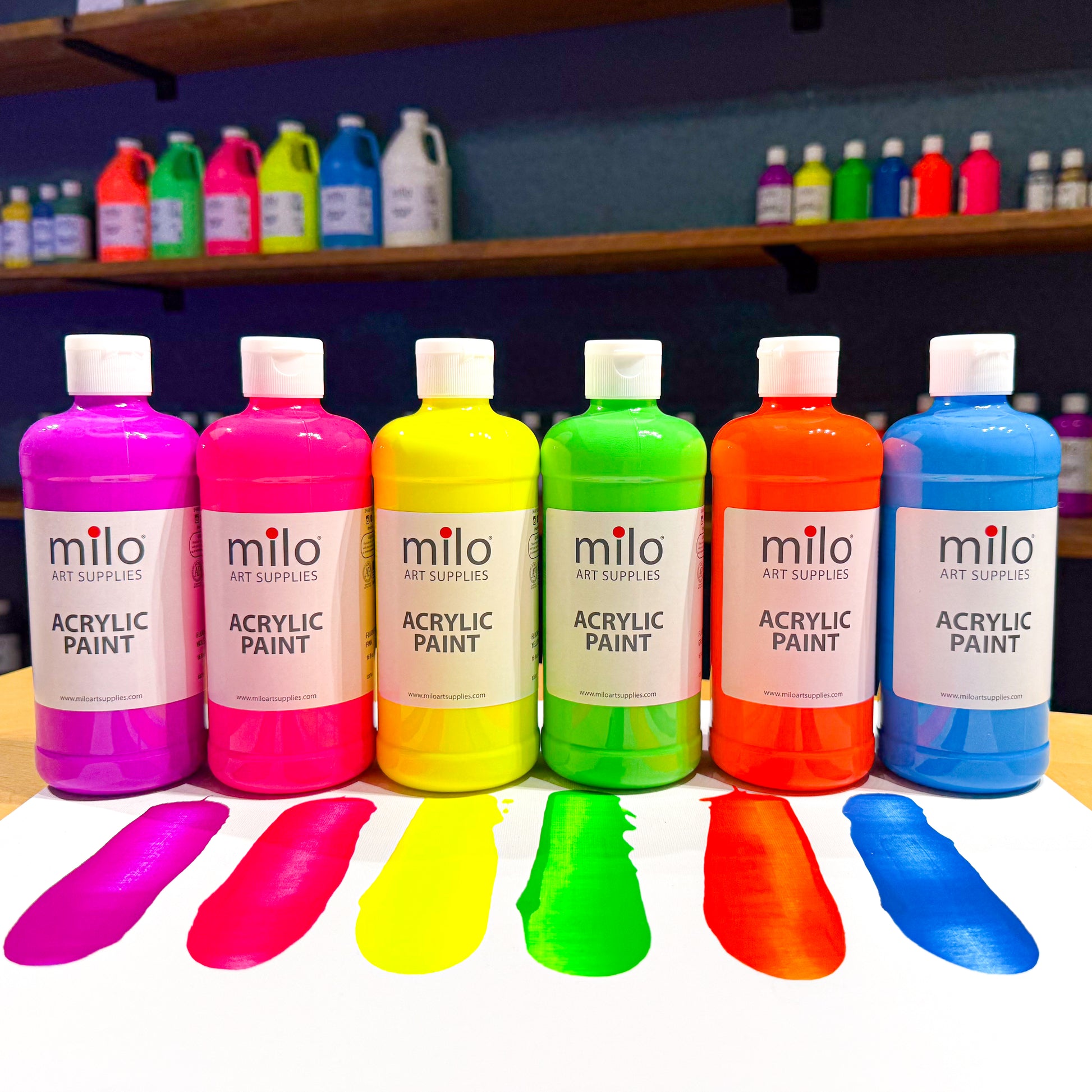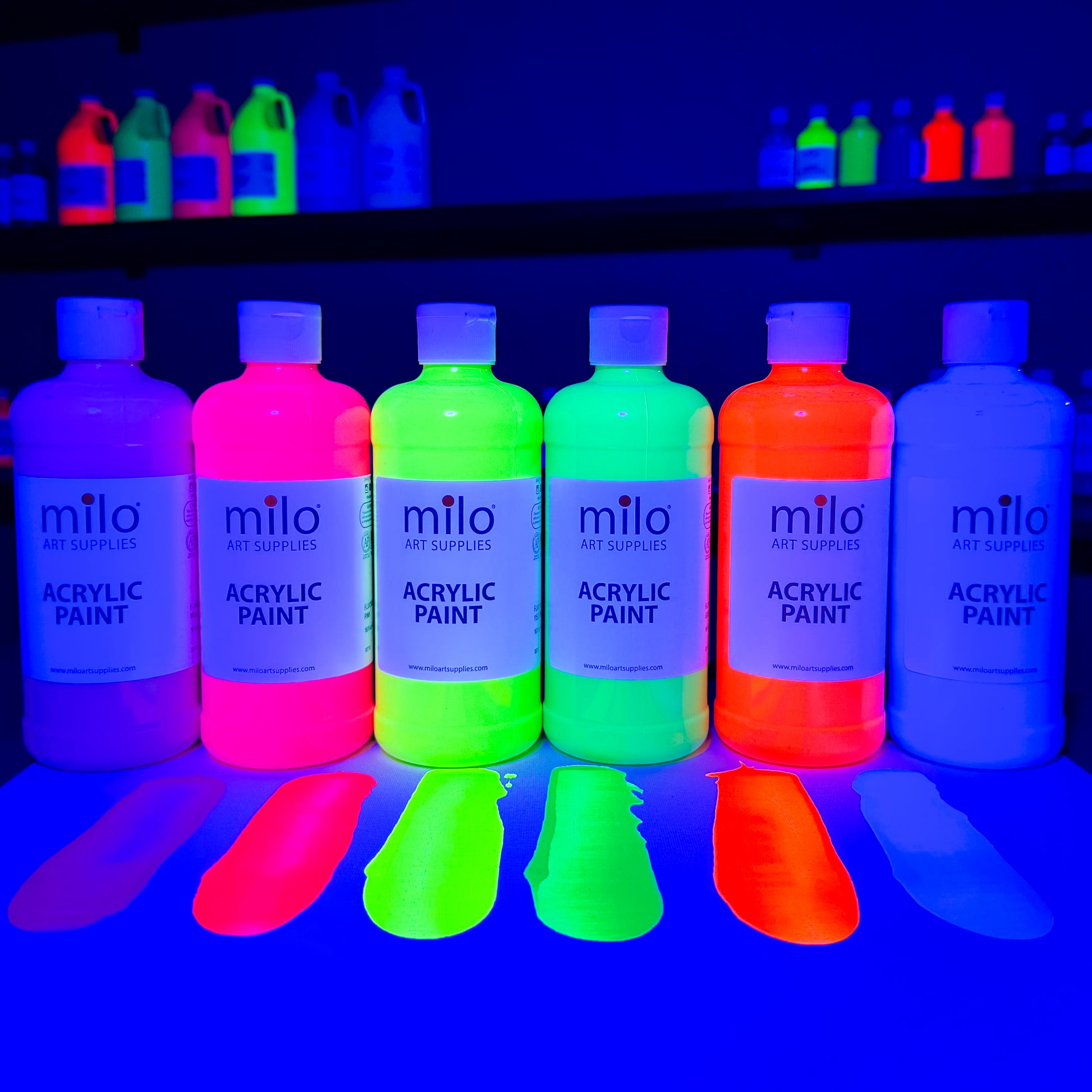 Milo Acrylic Fluorescent Paint Set of 6 Colors in 16 oz Bottles