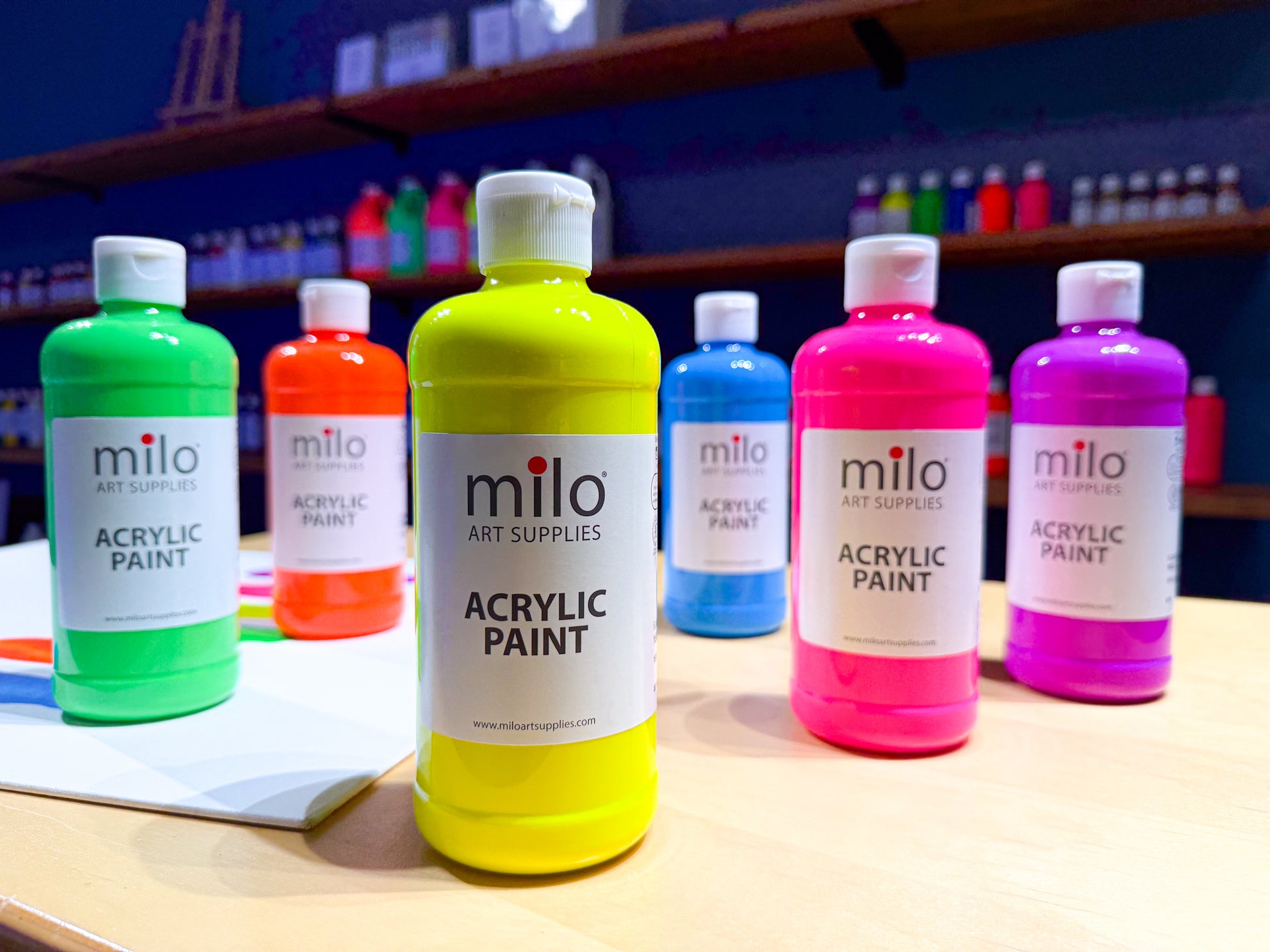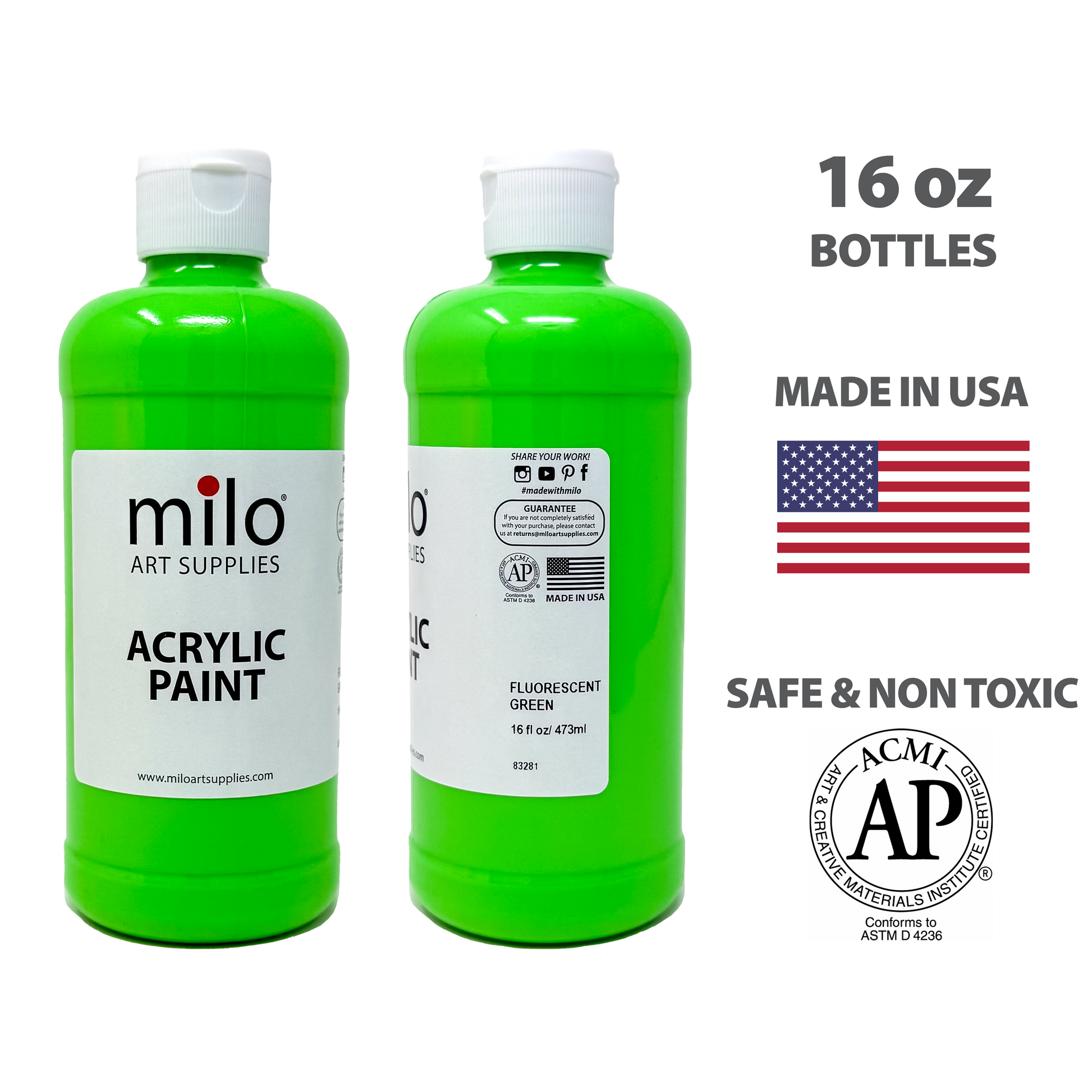 Milo Fluorescent Acrylic Paint comes in 16 oz bottles of 6 vibrant colors which include fluorescent pink, neon green, blue and more! Everything for you to get started on your next project.