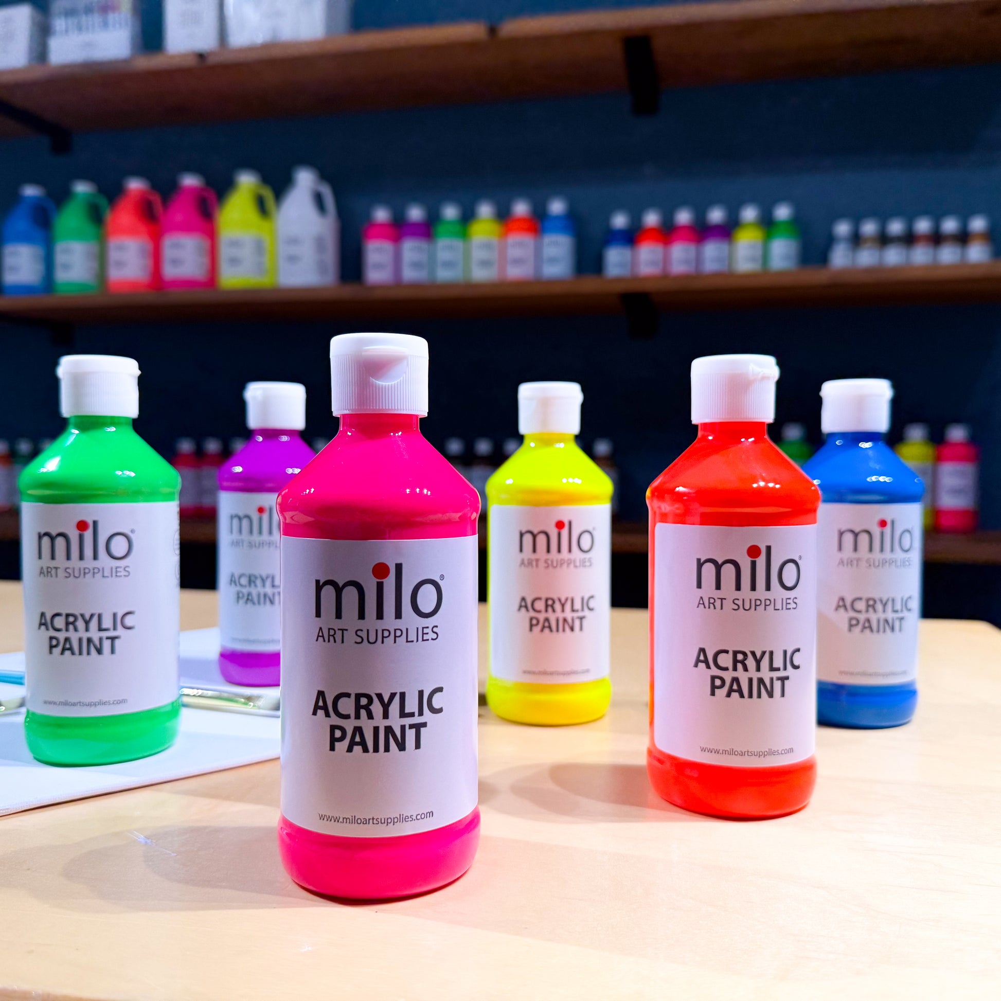 Milo Fluorescent Acrylic Paint comes in 8 oz bottles of 6 vibrant colors which include fluorescent pink, neon green, blue and more! Everything for you to get started on your next project.