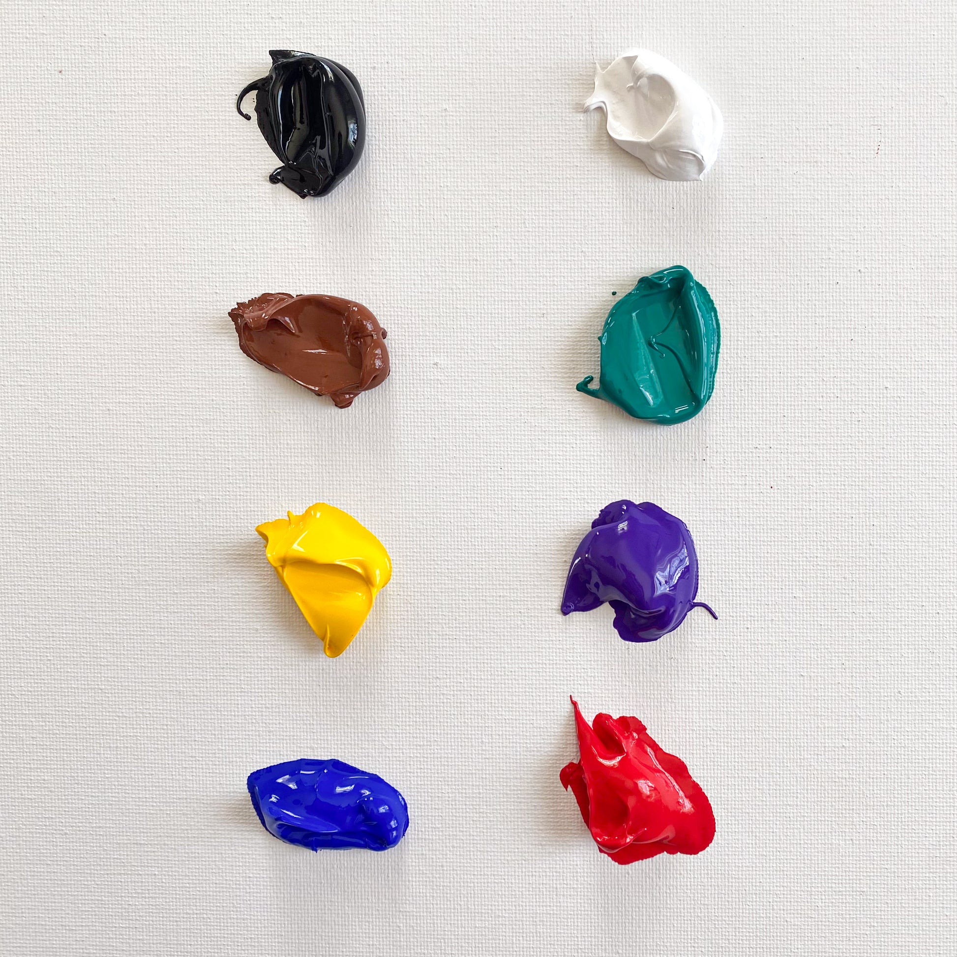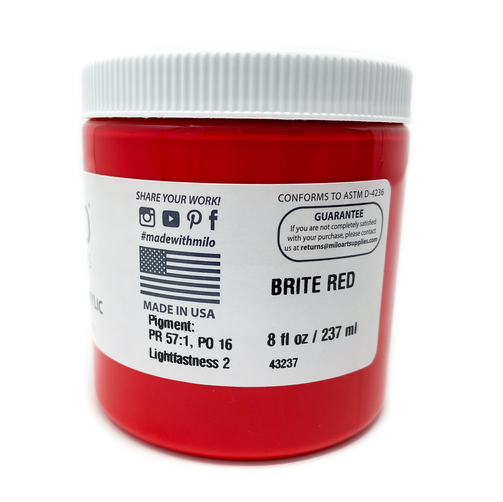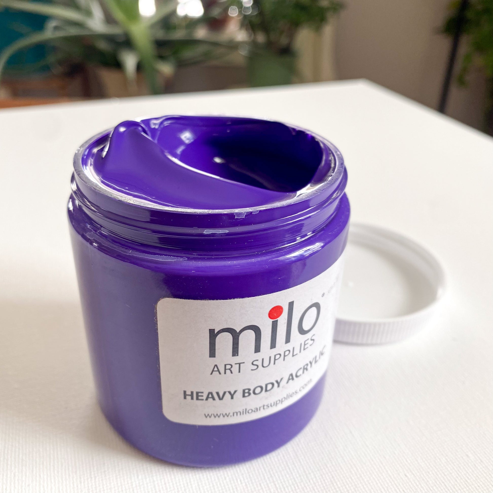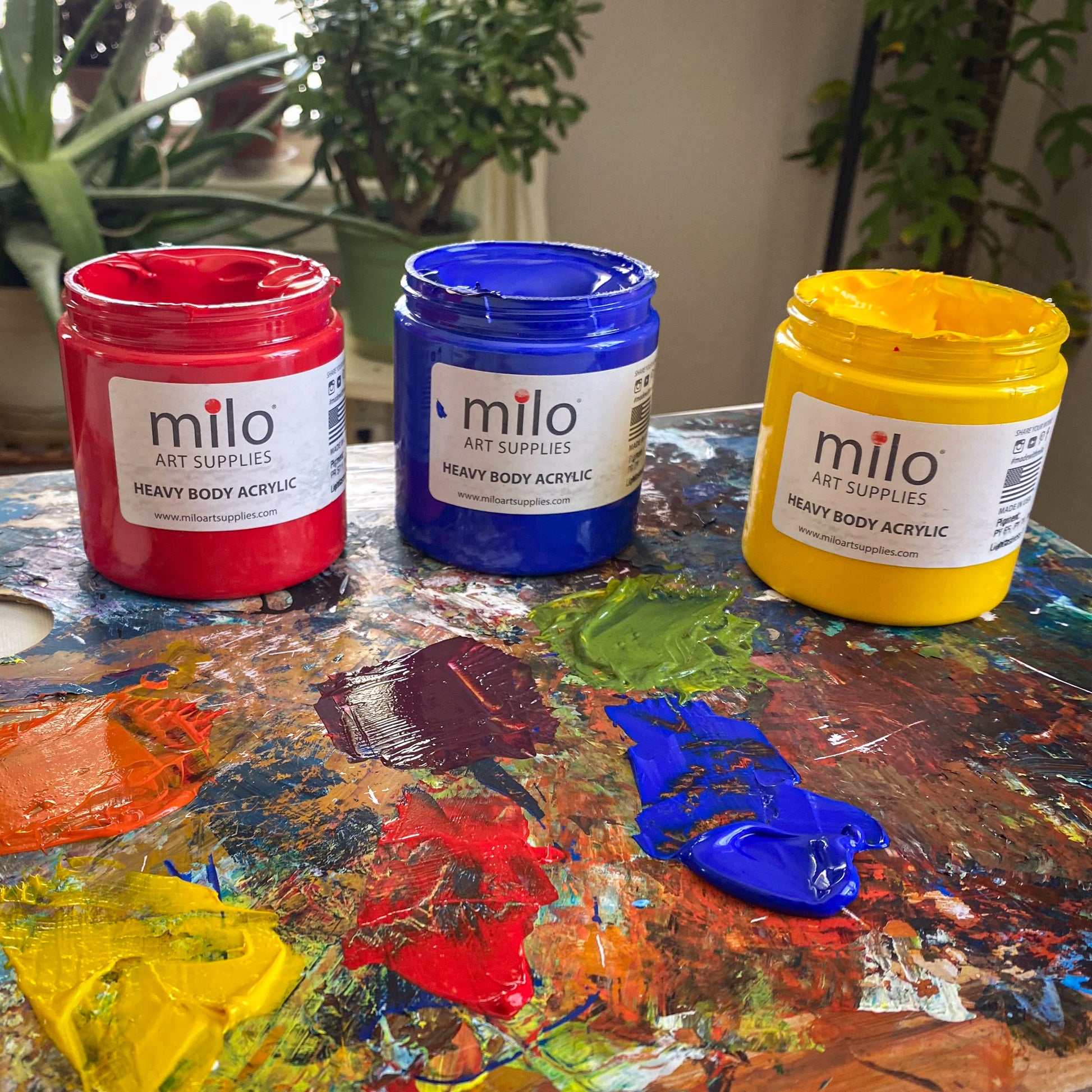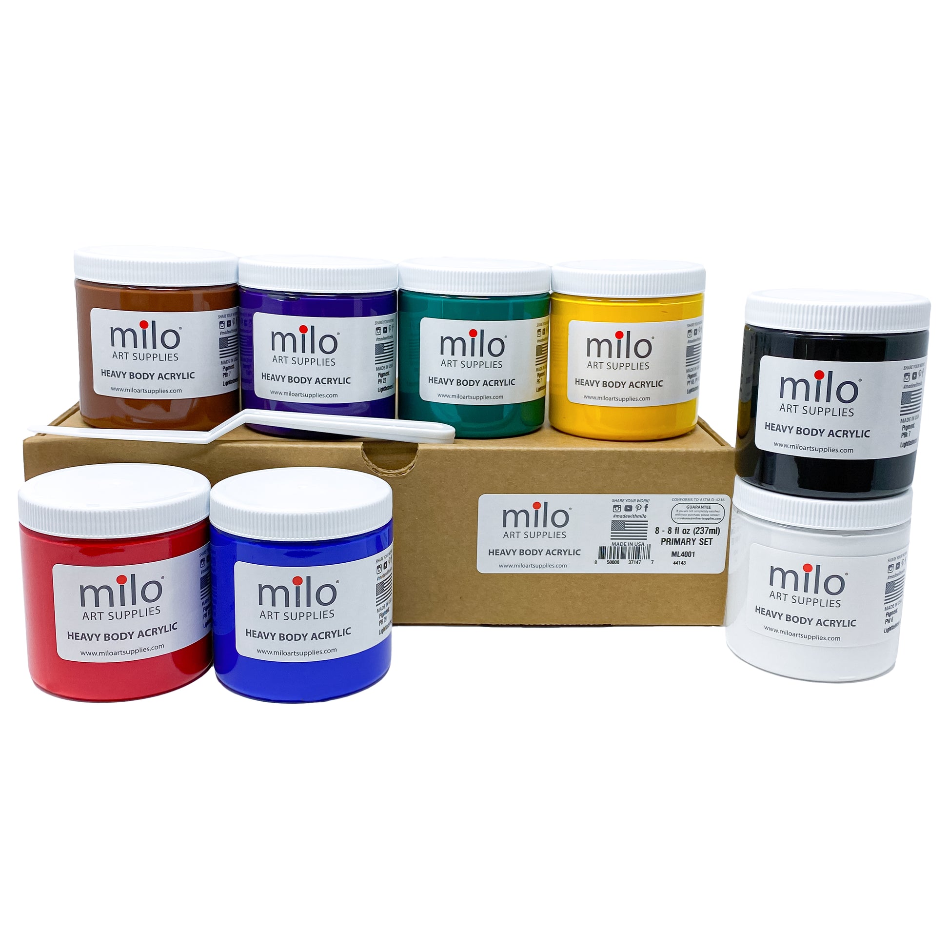 Milo Acrylic Paint comes in 8 oz jars of 8 vibrant colors which include the primary colors plus brown, green, and purple. Everything for you to get started on your next project.