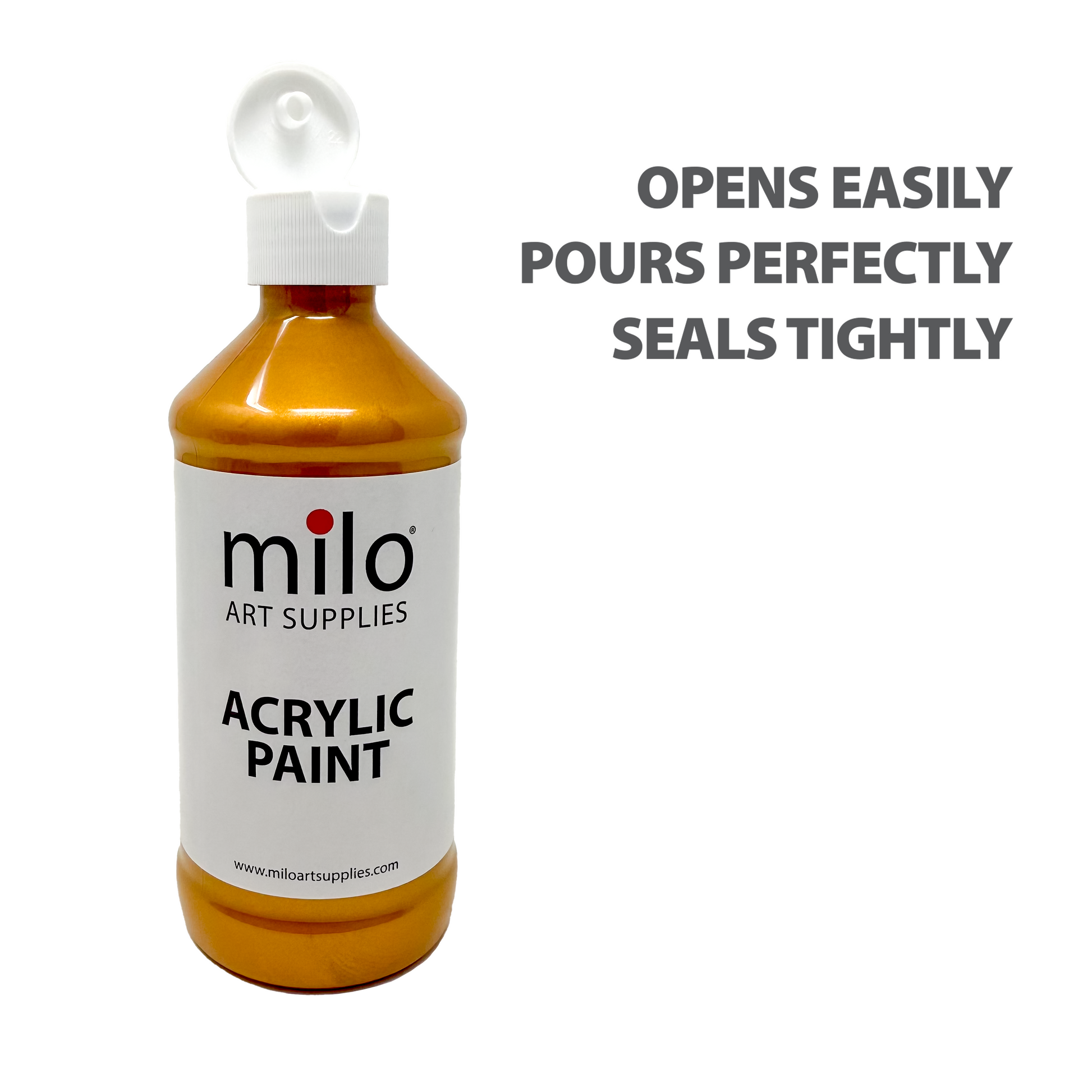 Milo Metallic Acrylic Paint comes in 8 oz bottles of 6 vibrant colors which include gold, silver, copper, and more shiny metal colors! Everything for you to get started on your next project.